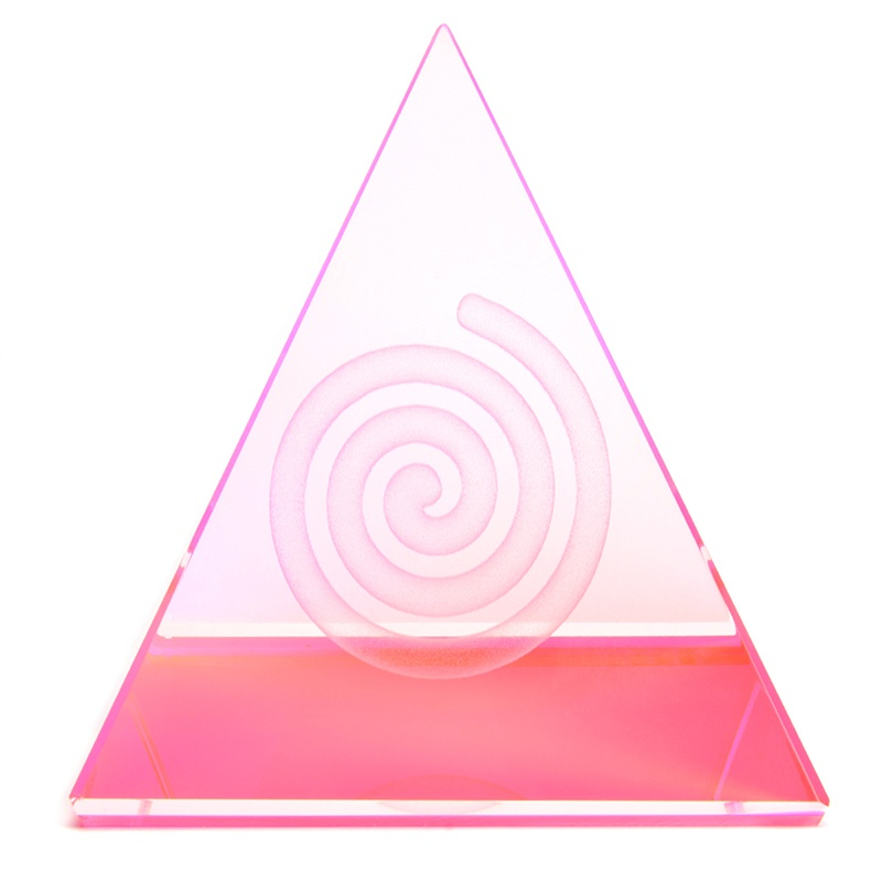 De levenstroom piramide is magenta-rose oranje en draagt een spiraal in het hart. De spiraal is een krachtig symbool dat positieve energie brengt en negatieve energie uitleidt. we evolueren spiraalsgewijs. Gelijke thema's komen in je leven voorbij en telkens weer op een ander niveau. Elk organisme of elk deel ervan kan de versterkende energie van de levensstroomspiraal opnemen. Algemeen genomen voert een linksdraaiende spiraal af en zorgt een rechtsdraaiende voor energietoevoer. Voel vooral voor je zelf hoe de beweging van deze spiraal op je uitwerkt; je kunt hem op alle windrichtingen plaatsen om je hele systeem te doorstromen. Test wel eerst op welke manier te beginnen want je lichaam moet het wel kunnen hebben. De levensstroomspiraal piramide staat ook voor de hartsenergie en puur liefde. Niet alleen voor anderen en al wat leeft, maar ook voor jezelf. Hiermee symboliseert het de bewuste en liefdevolle versmelting met de eigen ziel.
